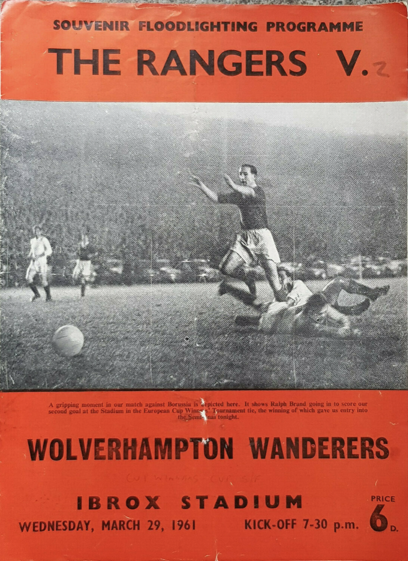 Rangers were drawn against the English FA Cup holders in the last four of the inaugural European Cup Winners Cup competition. Wolves were a formidable side at that time. In addition to defeating Blackburn Rovers 3-0 to win the FA Cup, they had gone toe-to-toe with Burnley and Tottenham Hotspur for the Division One title in season 1959/60. Stan Cullis’s side had won the previous two league titles, but defeat to the latter on the penultimate weekend of the season would ultimately prove costly in their quest for three-in-a-row, Burnley taking the title by a solitary point.